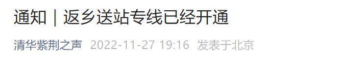 清华大学校团委公众号“清华紫荆之声”11月27日晚发出通知,为更好地服务并保障同学在返乡途中的健康安全,清华大学提前开通学生返乡“清华专线”,免费直送学生至北京西站、北京站、北京南站、朝阳站、丰台站、首都机场T2/T3、大兴机场7个站点。