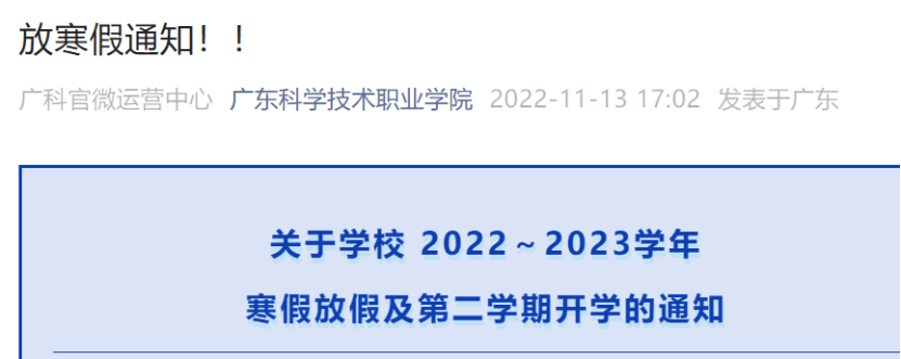 11月初,宁波职业技术学院网站发布了《关于调整2022-2023学年第一学期期末工作与寒假安排的通知》,原定1月9日开始放寒假,调整后的放假时间为1月4日。