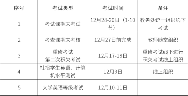 武汉体育学院近日发布了《关于做好2022-2023学年上学期假前教学工作的通知》,考试时间安排如下: