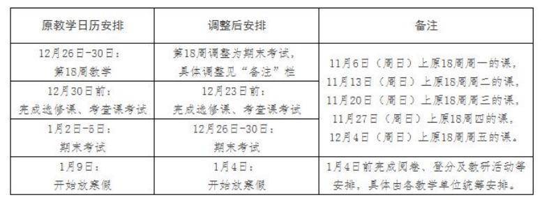 本学期教学周由原定的19个教学计划周,调整为18个教学计划周;各教学单位、各培养单位须在2022年12月30日(第18周周五)完成各项教学任务及课程考核;全体本科生和研究生于2022年12月31日前离校。