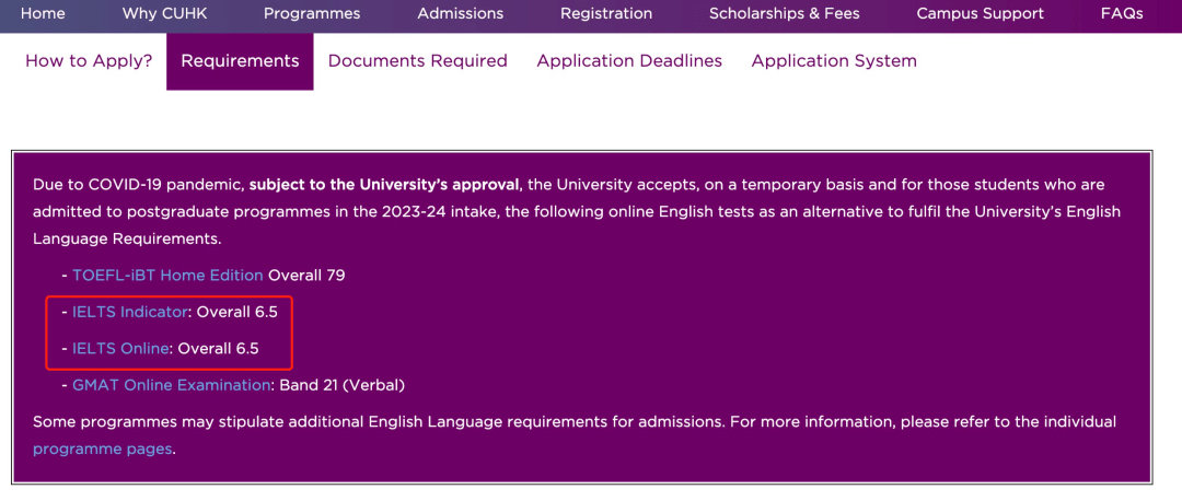 受疫情影响,经批准,针对2023-24学年研究生课程申请者,大学临时接受以下类型在线英语测试成绩作为有效申请材料,具体分数要求如下: