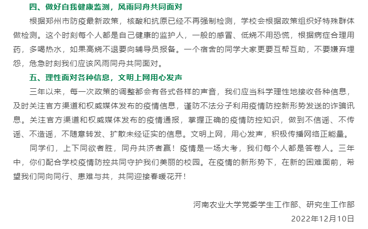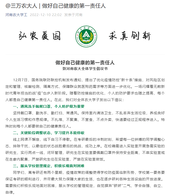 潇湘晨报记者注意到,12月10日,河南农业大学党委学生工作部、研究生工作部发布《做好自己健康的第一责任人——致河南农大全体学生倡议书》。倡议书称,12月7日,国务院联防联控机制发布通知,提出了优化疫情防控“新十条”措施,对风险区划定和管理、核酸检测、隔离方式、保障群众就医购药需求等方面进一步优化。倡议全体农大学子通风洗手佩戴口罩,不扎堆、不聚集、不堂食、不点外卖、快递要经过正规程序进入。