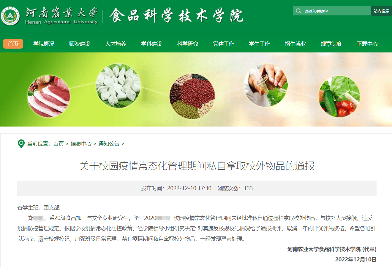 12月10日,河南农业大学食品科学技术学院通报,一名20级研究生未经批准私自通过栅栏拿取校外物品,对其违反校规校纪情况给予通报批评,取消一年内评优评先资格。该消息引发网友关注。