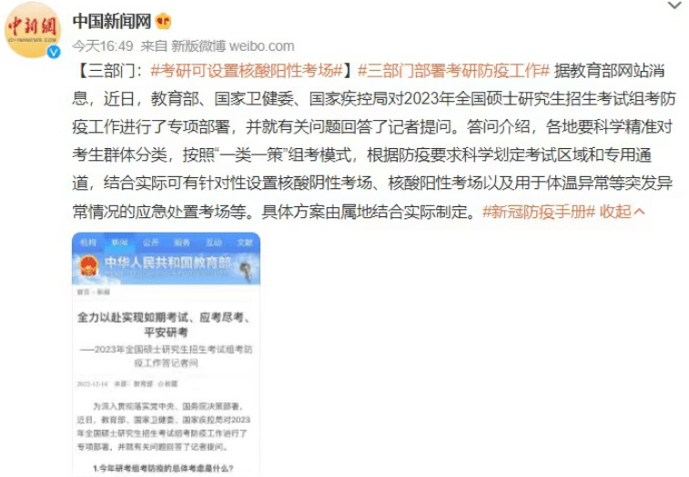 就目前的形势来说,研考延期显然是不太可能的,国家教育部、卫健委、疾控局已针对2023年研考做出了专项部署,同时各地相关部门也做出了积极地配合。