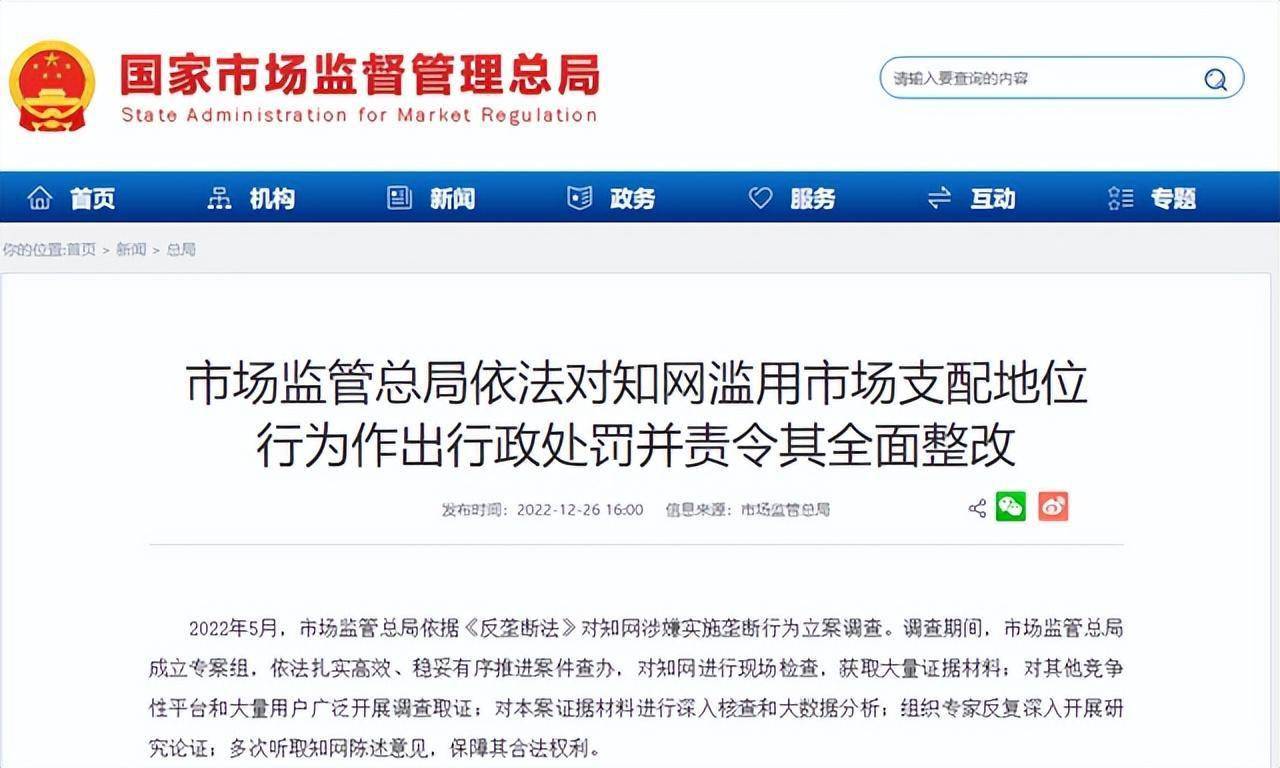 摘要: 原标题:重磅!知网被罚8760万元 发垄断财终于栽了 新华社12月26日消息,市场监管总局依法对知网滥用市场支配地位行为作出行政处罚并责令其全面整改,