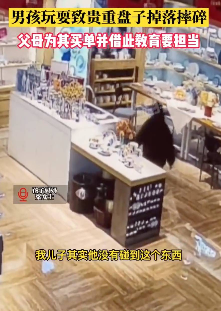 男孩母亲称:“我儿子其实他也没有碰到这个东西,那里面摆了一个水果,我儿子想去摸摸是真的假的。因为就我儿子一个人站在那边,然后店员就说(是我儿子摔坏了盘子),我说你报个价吧,打个八折,多少钱就当给小孩买个教训。因为小孩子当时都吓晕了,我老公就一直安慰孩子,教会他男人的一些担当。我感觉这一千块前花得还是比较值的,我儿子下次再也不敢了。”