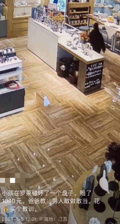 同时男孩母亲也在社交媒体上写道:“小孩碰坏了一个盘子,赔了1040元,爸爸教:男人敢做敢当,花钱买个教训。”