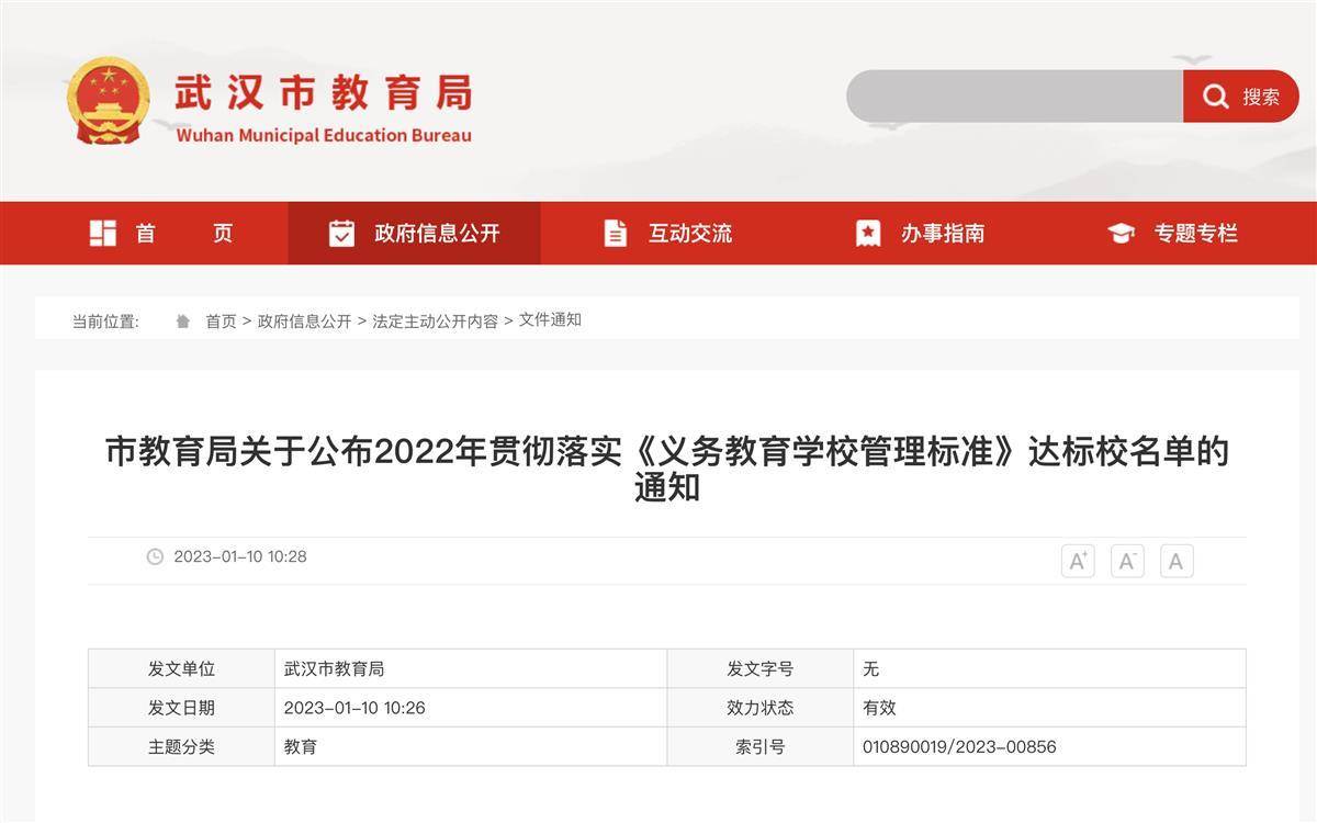 摘要: 原标题:快看!武汉市教育局公布最新达标校名单 199所学校上榜 1月10日,武汉市教育局官网发布2022年贯彻落实《义务教育学校管理标准》达标校名单的通知