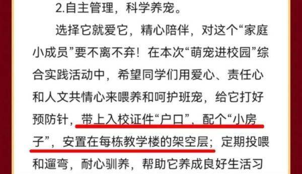 同时要求学生自主管理,科学养宠,选择它就爱它,精心陪伴,对这个“家庭小成员”要不离不弃。“希望同学们用爱心、责任心和人文共情心来喂养和呵护班宠,给它打好预防针,带上入校证件“户口”,配个“小房子”,安置在每栋教学楼的架空层。”