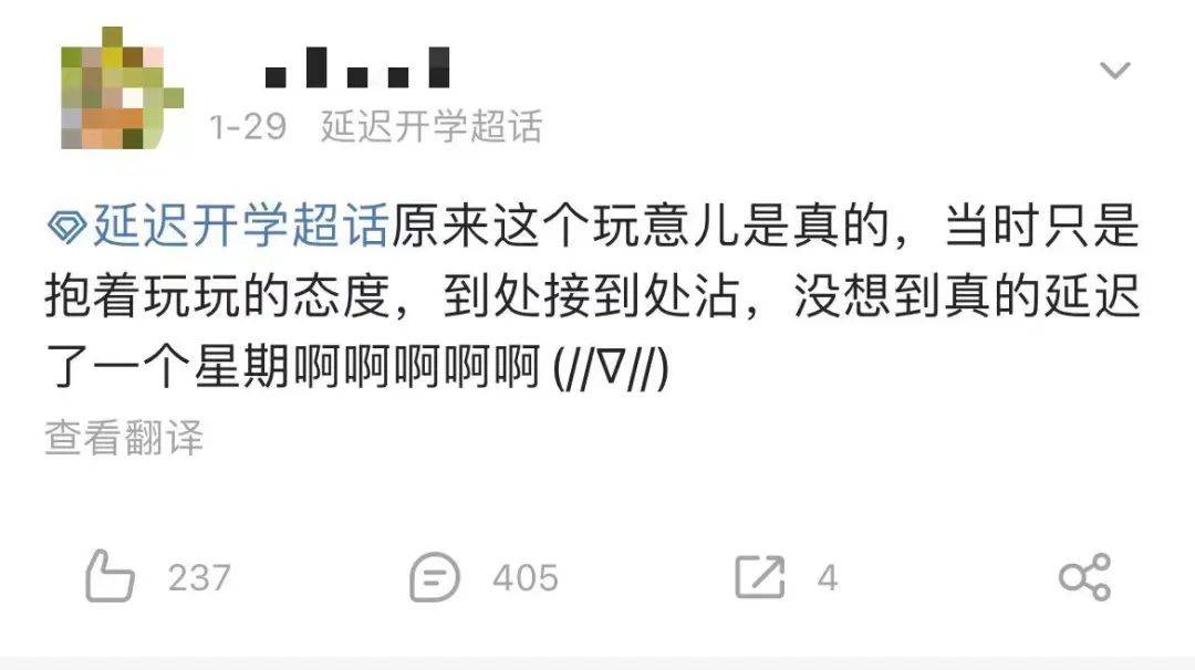 “听说转发这个帖子就能接到延迟开学” “没想到是真的诶!真的延迟了一周!”