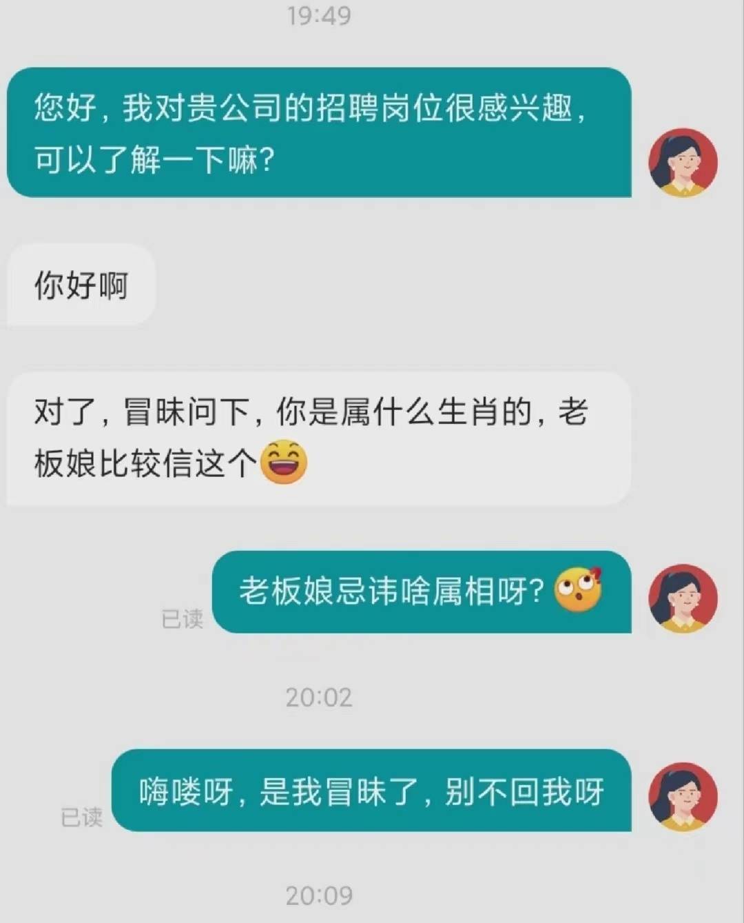 双方的聊天记录显示,HR在打招呼后便直接询问属相,称“老板娘比较信这个”。在肖同学问及“老板娘忌讳什么属相”后,对方并没有直接回应,而是让肖同学表明属相。