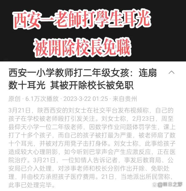 摘要: 原标题:老师连扇女生数十耳光被开除 别让教师成为暴力的传导者 近日,陕西西安的刘女士在社交平台发布视频称,自己的孩子在学校被老师殴打引发关