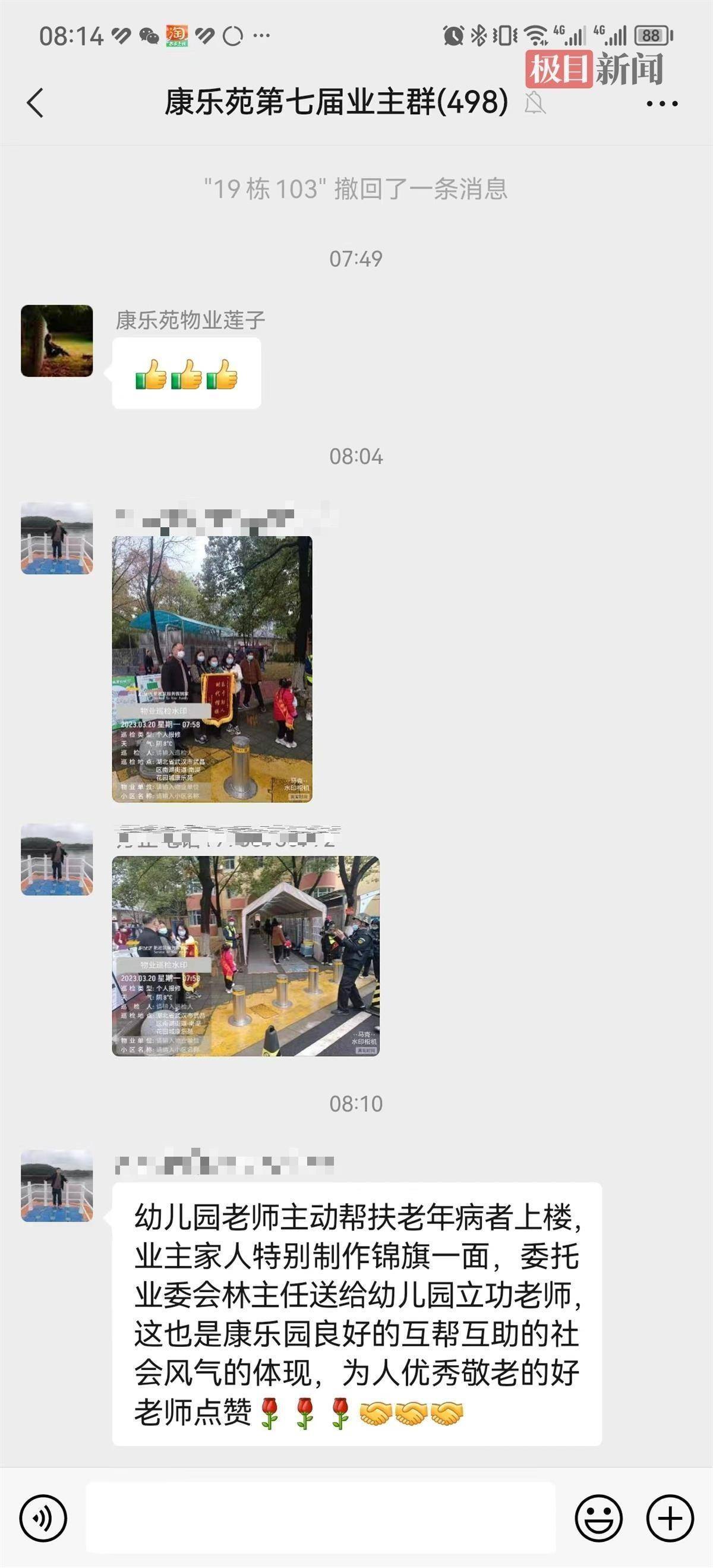 这件事不久就传到了该小区的业主群,业主们纷纷给方惠老师点赞。康乐幼儿园的园长蔡洁表示:“方惠老师这种赠人玫瑰,不求回报的行为充分体现了武昌教育人良好的精神面貌,值得我们所有老师学习,为方老师点赞!”