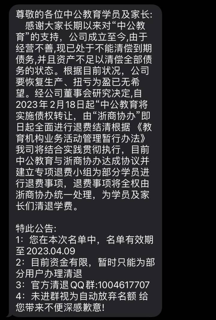 4月10日,潮新闻记者联系上一名收到短信的学员胡晓丽(化名),根据其提供的短信内容显示,“中公教育因经营不善,现已处于不能清偿到期债务的状态,将实施债权转让,由“浙商协办”即日起全面进行退费结清……目前中公教育与浙商协办达成协议并建立专项退费小组为部分学员进行退费事项,退费事项将全权由浙商协办统一处理,为学员及家长们清退学费。”