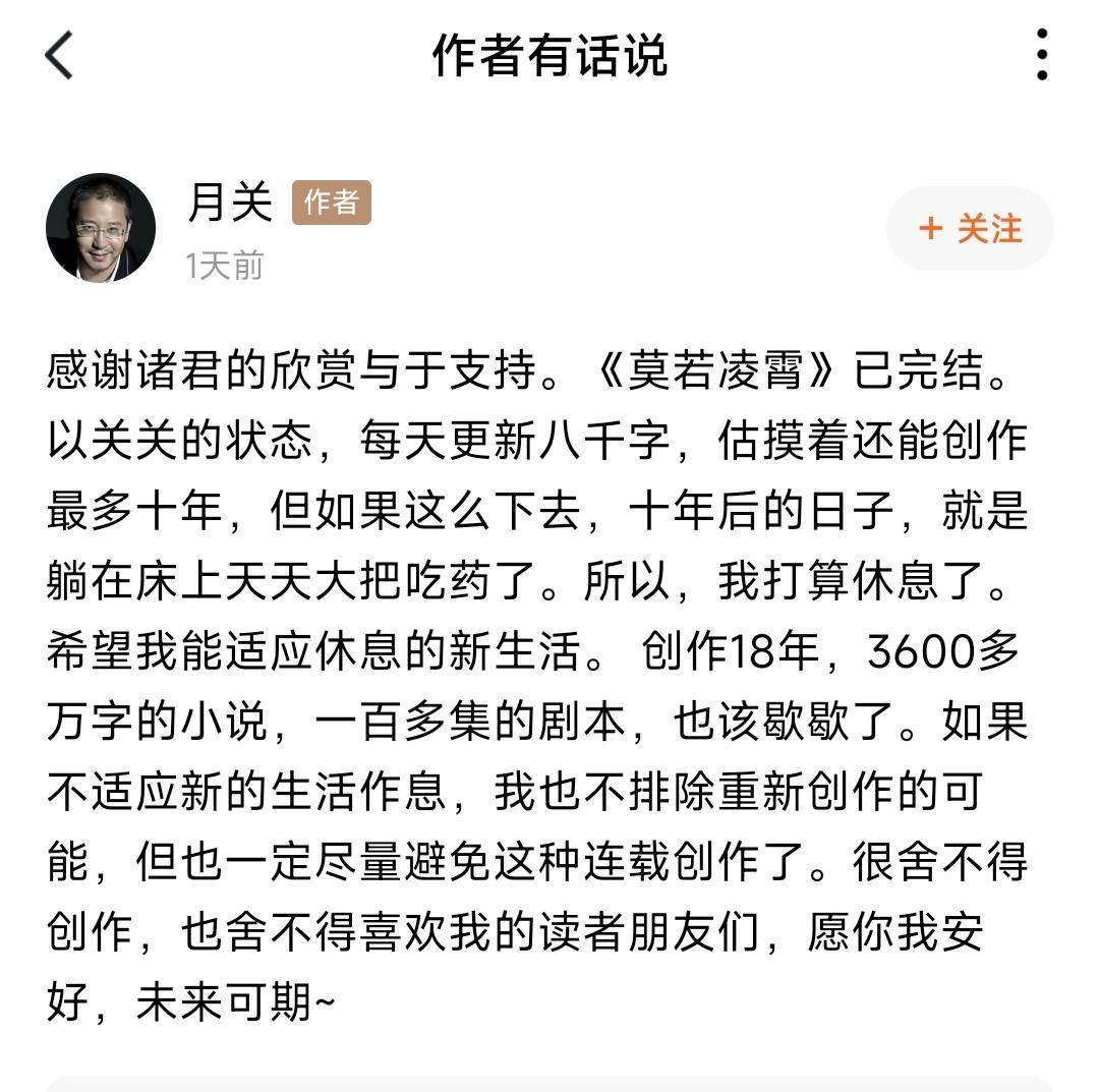 更新完最新著作《莫若凌霄》的最后一个章节后,月关发文写道:“感谢诸君的欣赏与支持,《莫若凌霄》已完结,以我的状态,每天更新八千字,估摸着还能创作最多十年,但如果这么下去,十年后的日子,就是躺在床上天天大把吃药了。”