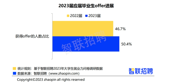 值得注意的是,今年毕业生求职过程中,学历与求职进展并不完全对等,大专和硕博毕业生获得offer的比例好于本科生。毕业生求职时的求稳心态有增无减,国企仍是首选。数据显示,大专、硕博求职毕业生中,获得offer的比例分别为54.4%、 56.7%,较总体分别高出4个、6.3个百分点;而本科求职毕业生中拿到offer的比例为47.5%,较总体低2.9个百分点。报告认为,两方面因素导致本科毕业生求职进展不佳,一是白领岗位在招聘时更青睐高学历人才,而蓝领岗位则偏好技术型毕业生;二是大多本科毕业生不具有且不愿意接受实用技术型岗位,只能与更高学历毕业生竞争,导致offer获得率较低。