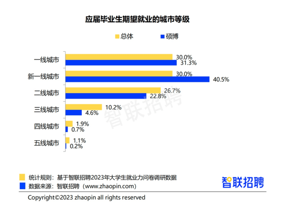 从毕业生期望的就业城市来看,一线及新一线占比均为30%,二、三线分别占比26.7%、10.2%,四、五线占比则均不足2%。分学历来看,硕博毕业生对新一线的偏好更明显,占比40.5%,较偏好一线的占比高出9.2个百分点,且高于总体10.5个百分点。新一线城市成为高学历毕业生的首要偏好,一方面与一线城市产业疏解及其他扶持政策有关,另一方面也与毕业生“一线城市情结”减弱有关。高学历人才对新一线的明显青睐,有助于弥补新一线城市与一线城市的人才差距,为新一线城市未来发展提供强有力支持。