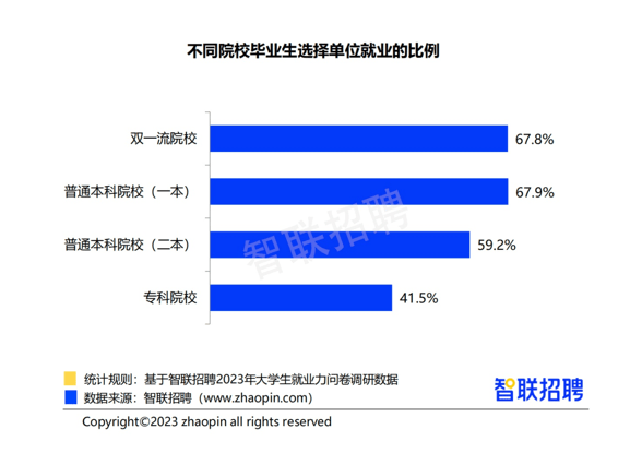 今年的毕业生们更倾向于哪些岗位和企业?根据智联招聘近日发布的2023大学生就业力调研报告显示,单位就业比例上升,自由职业比例有所下降;大专和硕博毕业生获得offer的比例好于本科生。