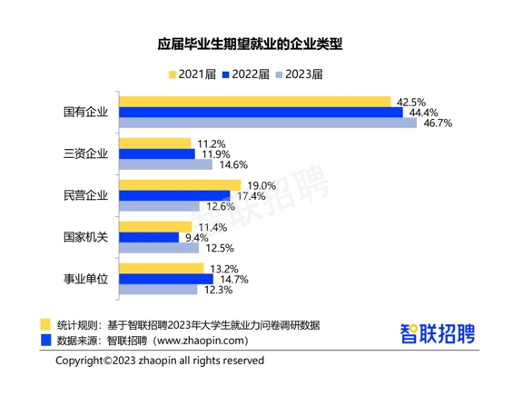 从求职的企业类型看,2023届毕业生求职时的求稳心态有增无减,国企仍是首选,对民企的兴趣则持续回落。46.7%的应届毕业生求职时倾向于国有企业,较去年上升2.3个百分点,且连续三年呈上升态势。选择民营企业的占比12.6%,较去年下降4.8个百分点,连续三年呈下降态势。