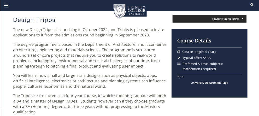 此专业名为 Design Tripos,“Tripos”这个词是剑桥大学独有的,就是剑桥大学文学士荣誉学位考试的意思。