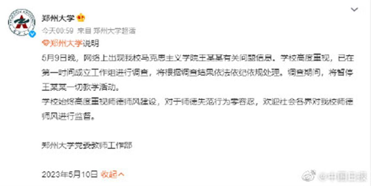 近日,有网友爆料称自己在11年前遭郑州大学一老师PUA长达两年半,遭侵犯致怀孕后还被其带去医院打胎。5月10日,郑州大学党委教师工作部发布说明称,5月9日晚,网络上出现该校马克思主义学院王某某有关问题信息。学校高度重视,已在第一时间成立工作组进行调查,将根据调查结果依法依纪依规处理。调查期间,将暂停王某某一切教学活动。