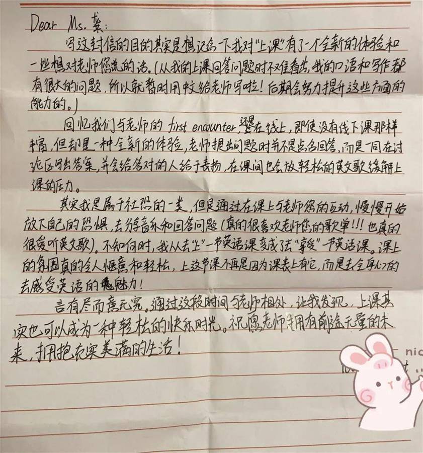 一名学生在给龚佳玉手写的致谢信中提到,由于课上的互动,自己从“上”英语课变成“享受”英语课。“上这节课不再是因为课表上有它,而是去全身心去感受英语的魅力!”这句话让龚佳玉很受触动。