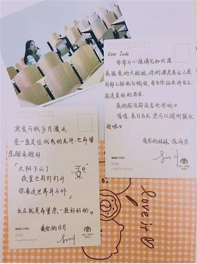 龚佳玉常常主动和心情不好的学生谈心,以自身经历开导学生走出负面情绪。学生也愿意跟这个姐姐一样的老师交流,聊天记录里,全是真情流露。曾经有学生把她的照片做成明信片,并写上寄语送给她。更有学生自发地和她分享家乡美食,又或是默默地献上一个拥抱。学生们或安静努力,或热情大方,都会用自己的方式回应她,这是师生间最美好的双向奔赴。