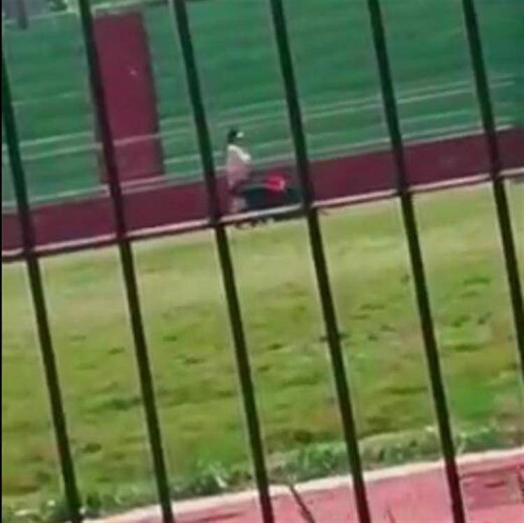 视频显示,在一处操场内,有人员在跑道上跪地爬行,一旁还有人跟着其向前行走。