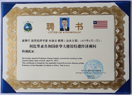 2023年4月28日,利比里亚共和国驻华大使馆聘任旅美经济学家向凌云教授为利比里亚共和国驻华大使馆特邀经济顾问。