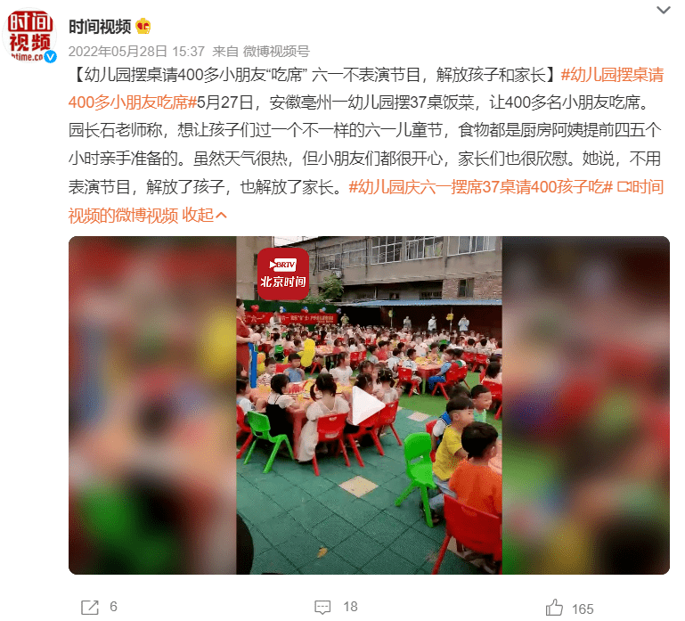 去年的“六一”儿童节,有一条新闻冲上热搜——幼儿园摆37桌请420个孩子吃席庆祝“六一”,网友家长都点赞。原来,安徽亳州一家幼儿园,没有组织文艺表演之类的庆祝活动,而是用“摆席”的方式,给孩子们准备了一大桌好吃的。这样多好,没有任务,开开心心才是真正的儿童节。孩子不用排练,老师和父母都更轻松。