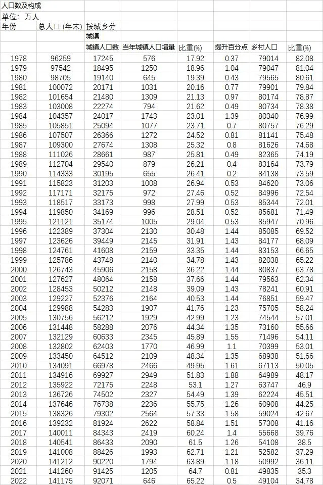 表:1978年以来历年城乡人口变化