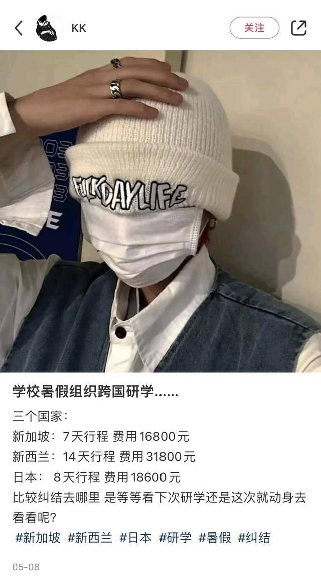 博主kk在某平台上公布了学校暑期组织的跨国研学计划:新加坡7天行程费用16800元;新西兰14天行程费用31800元;日本8天行程费用18600元。kk表示,“比较纠结去哪里,是等等看下次研学还是这次就动身去看看呢?”网友们纷纷给他留言支招,“玩的啥这么贵啊,不如自己去旅游”“坑人吧”“坚决不去”。
