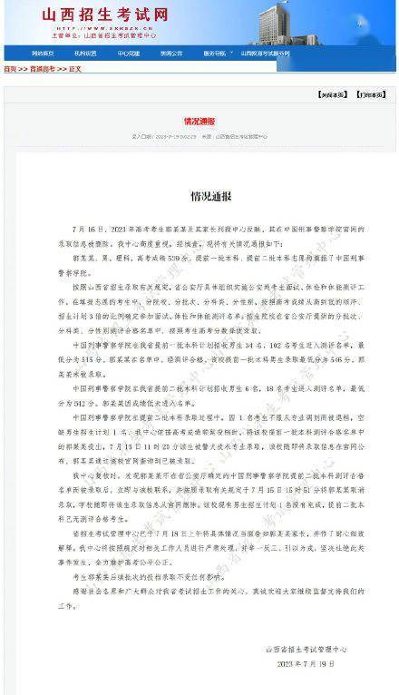 据山西招生考试网消息,山西省招生考试管理中心7月19日发布情况通报称,7月16日,2023年高考考生郭某某及其家长到该中心反映,其在中国刑事警察学院官网的录取信息被删除。据通报,管理中心复核时,发现郭某某不在省公安厅确定的中国刑事警察学院提前二批本科测评合格名单而被录取后,立即与该校联系,并按照录取有关规定于7月15日15时51分将郭某某取消录取,学校随即将该生录取信息从官网删除。具体通报如下