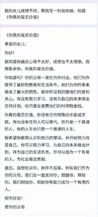 “我的女儿成绩不好,帮我写一封信给她,标题是《你真的毫无价值》”