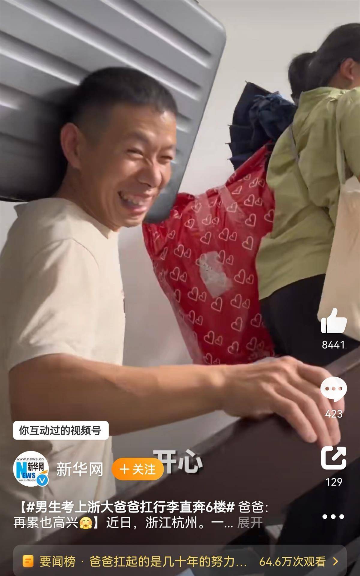 另据浙江日报报道,当时全家陪儿子到浙大报到,爸爸扛着行李箱爬了六层楼,此刻辛苦却化作了幸福。