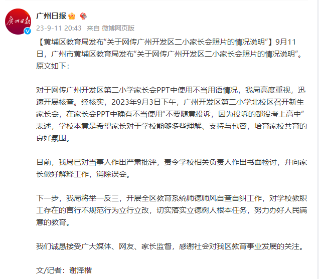 对于网传广州开发区第二小学家长会PPT中使用不当用语情况,我局高度重视,迅速开展核查。经核实,2023年9月3日下午,广州开发区第二小学北校区召开新生家长会,在家长会PPT中确有不当使用“不要随意投诉,因为投诉的都没考上高中”表述,学校本意是希望家长对于学校能够多些理解、支持与包容,培育家校共育的良好氛围。