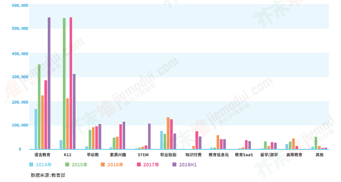 根据《芥末堆2018教育行业蓝皮书》数据显示,2018上半年教育行业融资总额约为147.1亿元人民币,已经非常接近去年全年151.1亿元的水平。2018年上半年,语言教育和K12赛道获投数额遥遥领先,分别是55.3亿人民币和31.8亿人民币。语言教育、早幼教、素质教育、STEM在2018上半年的融资额已经超过2017全年。