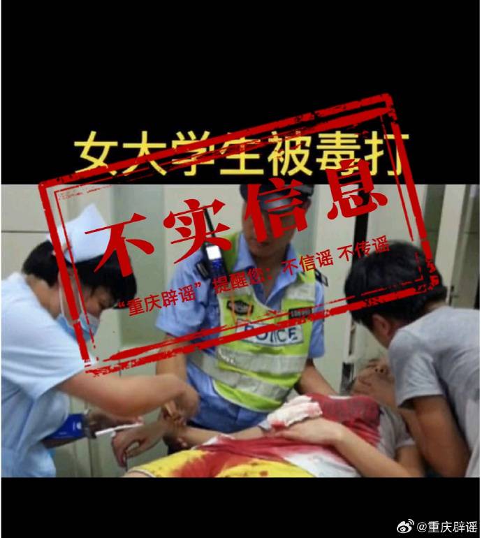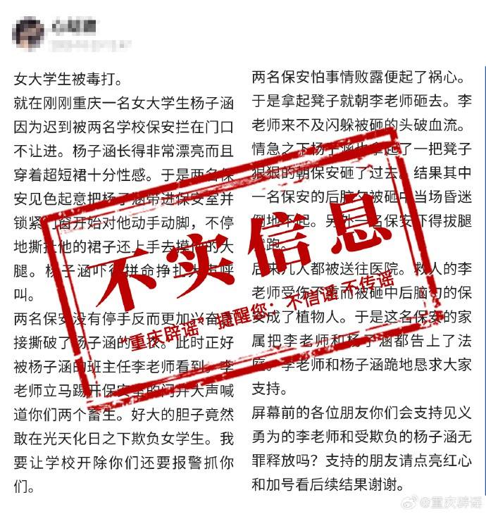 10月24日,据重庆市互联网违法和不良信息举报中心官方微博“重庆辟谣”消息:10月23日,有网民在网络平台发帖称,重庆一名女大学生,被学校两名保安调戏殴打。经向重庆公安部门核实,近期未发生类似案件,正在进一步核查。