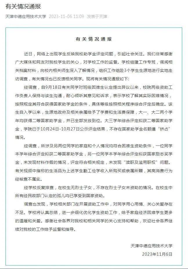 近日,天津中德应用技术大学学生反映助学金评定问题的视频,引发网民关注。11月6日,天津中德应用技术大学发布了有关情况通报,全文如下↓