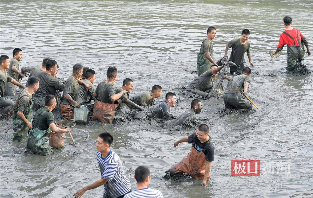 军士大队的参赛同学们对鱼进行称重后,该校普通学院的8支参赛队伍开展比拼,大家热情高涨,扑进鱼塘开始抓鱼“大战”,为了给队员们助阵,站在岸上的同学们甚至拿起扩音喇叭高喊加油助威。