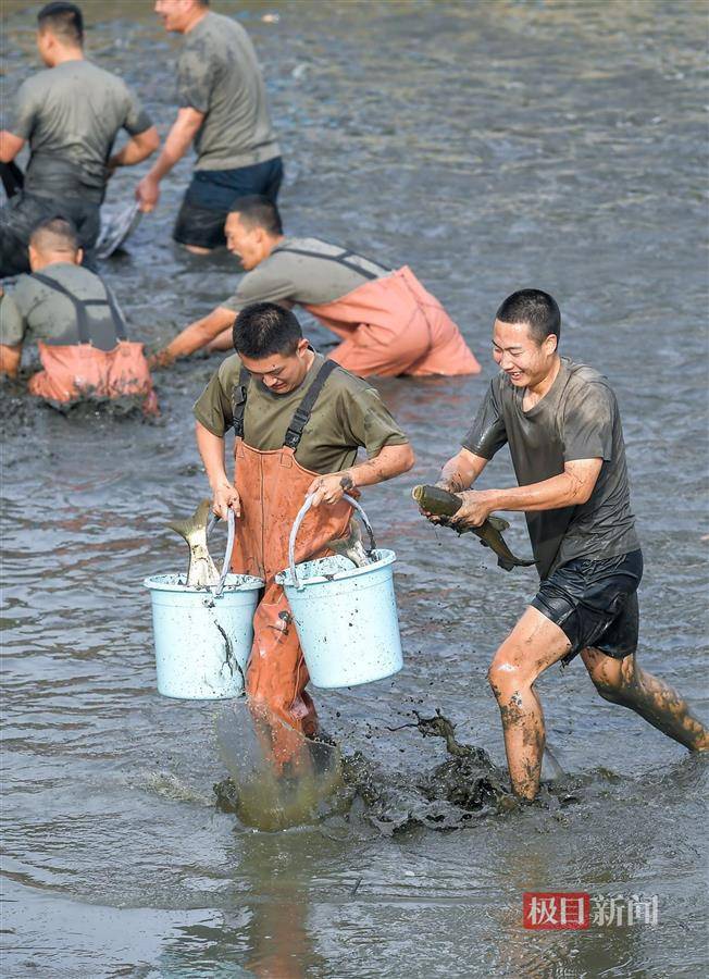 捕鱼过程中,军士大队的同学们兵分两队,大部分同学在水塘里捕鱼装桶,岸边的同学则进行接应,他们将捕获的鱼倒入白色鱼筐内,并向水塘的队友投递捕鱼和装载工具,岸边围满了观众。半小时后,随着一声“收网”,军士生队伍开始在湖边集结运鱼,一条条大鱼活蹦乱跳,现场好不热闹。