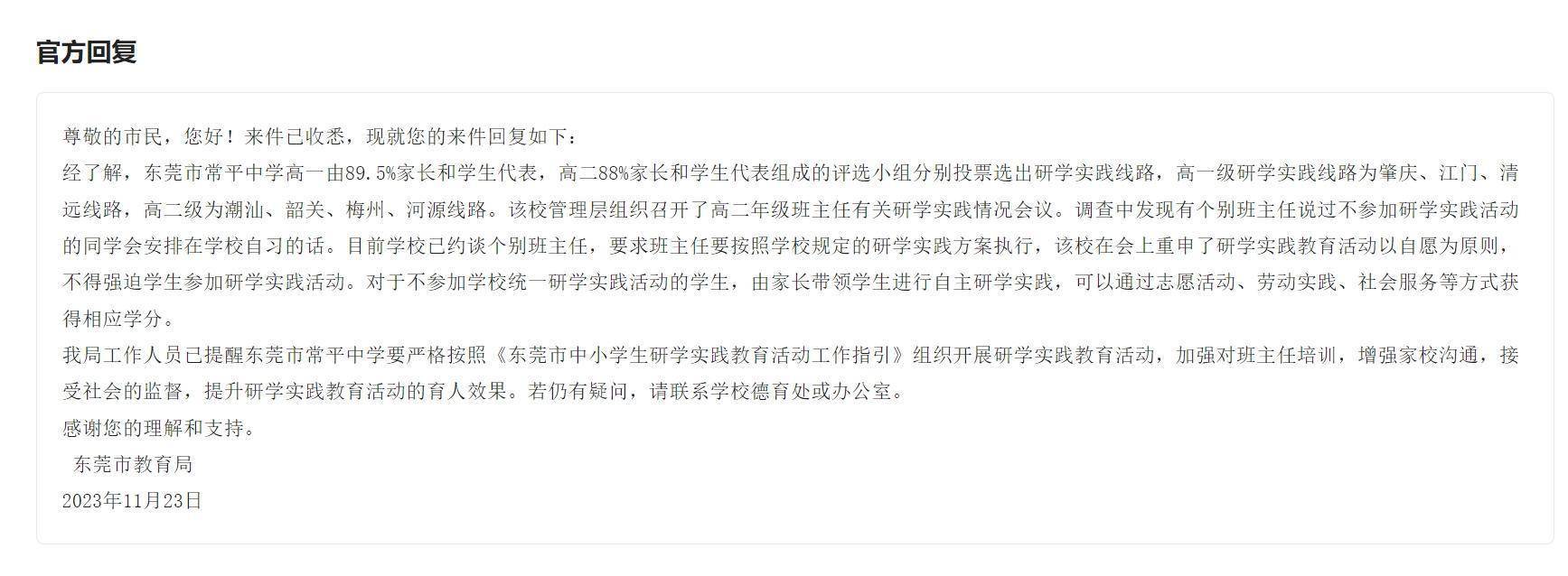 对此,东莞市教育局作出了公开回应。市教育局称,常平中学管理层组织召开了高二年级班主任有关研学实践情况会议。调查中发现有个别班主任说过不参加研学实践活动的同学会安排在学校自习的话。目前学校已约谈个别班主任,要求班主任要按照学校规定的研学实践方案执行,该校在会上重申了研学实践教育活动以自愿为原则,不得强迫学生参加研学实践活动。对于不参加学校统一研学实践活动的学生,由家长带领学生进行自主研学实践,可以通过志愿活动、劳动实践、社会服务等方式获得相应学分。