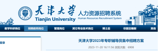 近日,《天津大学2023年专职辅导员集中招聘方案》公布,据悉,该校专职辅导员基础岗位共招聘7人,人才计划岗位、银发计划岗位若干人,每人仅限投1个岗位。