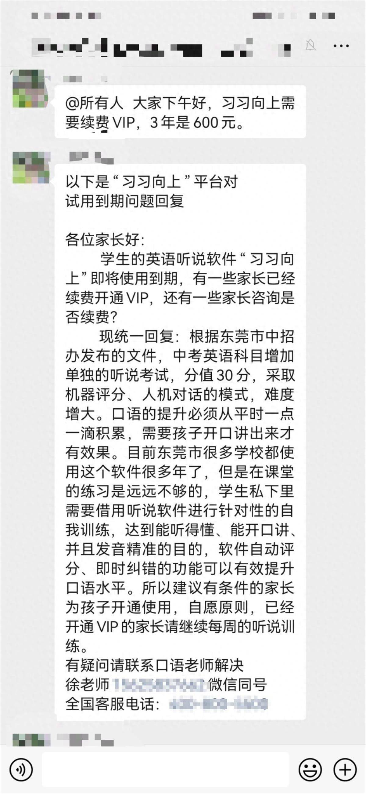 网传群聊截图中,有人发文称:“各位家长好,学生的英语听说软件即将使用到期,有一些家长已经续费开通VIP,还有一些家长咨询是否续费?现统一回复:根据东莞市中招办发布的文件,中考英语科目增加单独的听说考试,分值30分,采取机器评分、人机对话的模式,难度增大……所以建议有条件的家长为孩子开通使用,自愿原则,已经开通VIP的家长请继续每周的听说训练。”