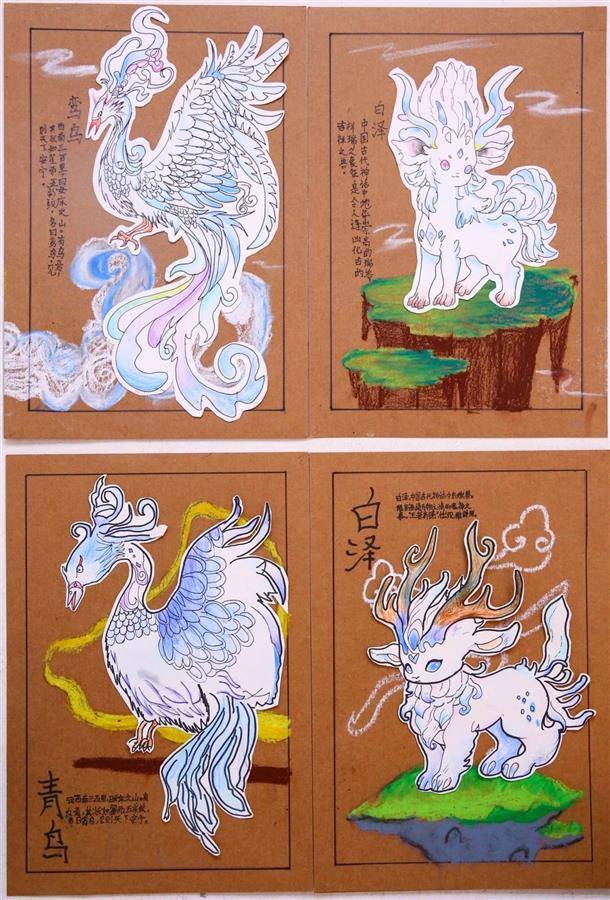 通过老师的讲述,学生们了解了《山海经》故事,并通过故事与想象的结合,创作了一幅幅精美的《山海经》画作,作品完成后被学校收录装框,进行展示,为校园文化建设增添了一抹色彩。