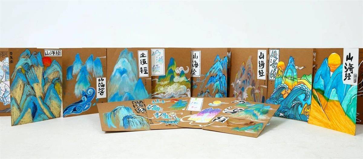 除此之外,在学校图书馆门口展示的《山海经》画册,也是出自综合素质文体班的孩子们之手。