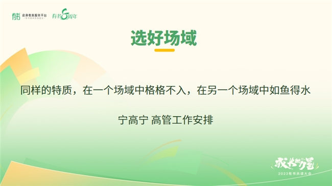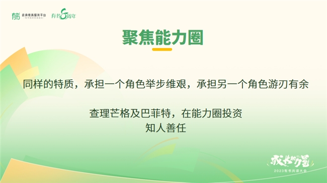 书友们的成功同时也印证了聚焦能力圈的重要性:同样的特质,同样的能力,如果承担一个合适的角色,就会游刃有余,承担不合适的角色可能就会举步维艰。