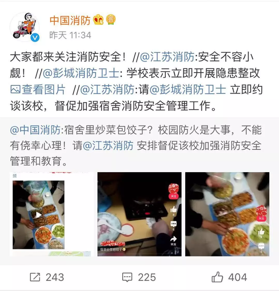 随后,三级消防部门官微进行了接力10点15分,@江苏消防:请@彭城消防卫士立即约谈该校,督促加强宿舍消防安全管理工作。