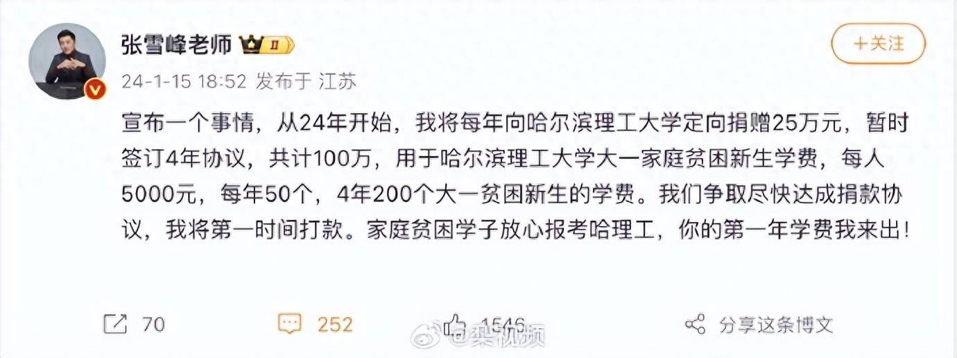 1月15日,@张雪峰老师 发文宣布:从2024年开始,将每年向哈尔滨理工大学定向捐赠25万元,暂时签订4年协议,共计100万,用于哈尔滨理工大学大一家庭贫困新生学费,每人5000元,每年50个,4年200个大一贫困新生的学费。