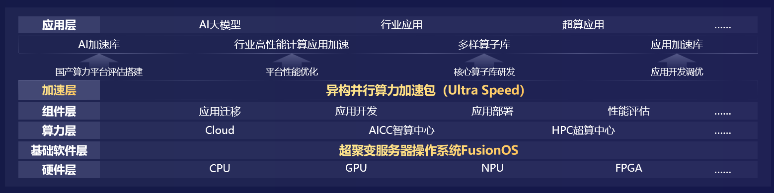 异构计算平台并行加速解决方案以开源加速库为锚点,提供集算子、算法为一体的综合优化方案,采用异构计算并行加速的方式作为算力供给的主流方式,提供基于通用算力+AI智算和异构算力的计算资源,能够广泛为各行各业提供迫切需要的安全、稳定、高效的算力解决方案。